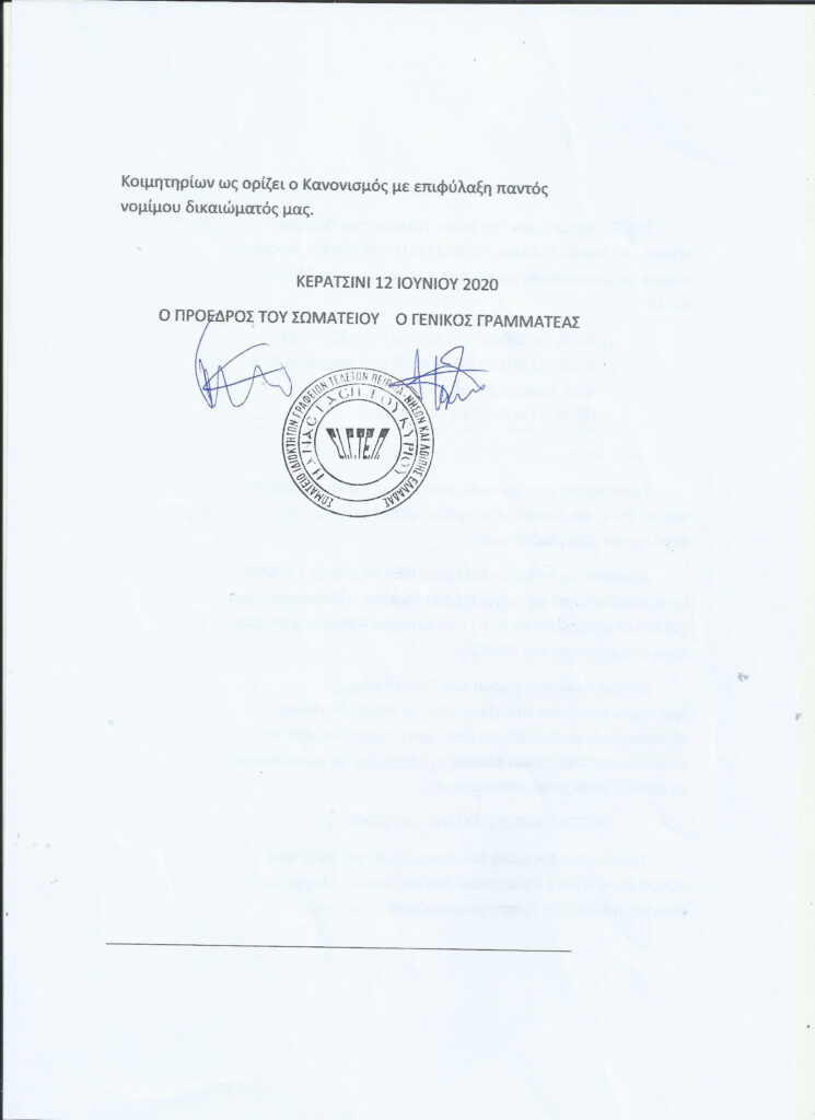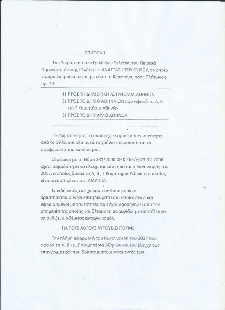 ΕΠΙΣΤΟΛΗ ΤΟΥ ΣΩΜΑΤΕΙΟΥ ΜΑΣ ΓΙΑ ΤΗΝ ΠΛΗΡΗ ΕΦΑΡΜΟΓΗ ΤΟΥ ΚΑΝΟΝΙΣΜΟΥ ΛΕΙΤΟΥΡΓΙΑΣ ΣΕ Ά,΄Β,΄Γ ΚΟΙΜΗΤΗΡΙΑ ΑΘΗΝΩΝ