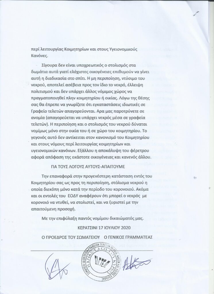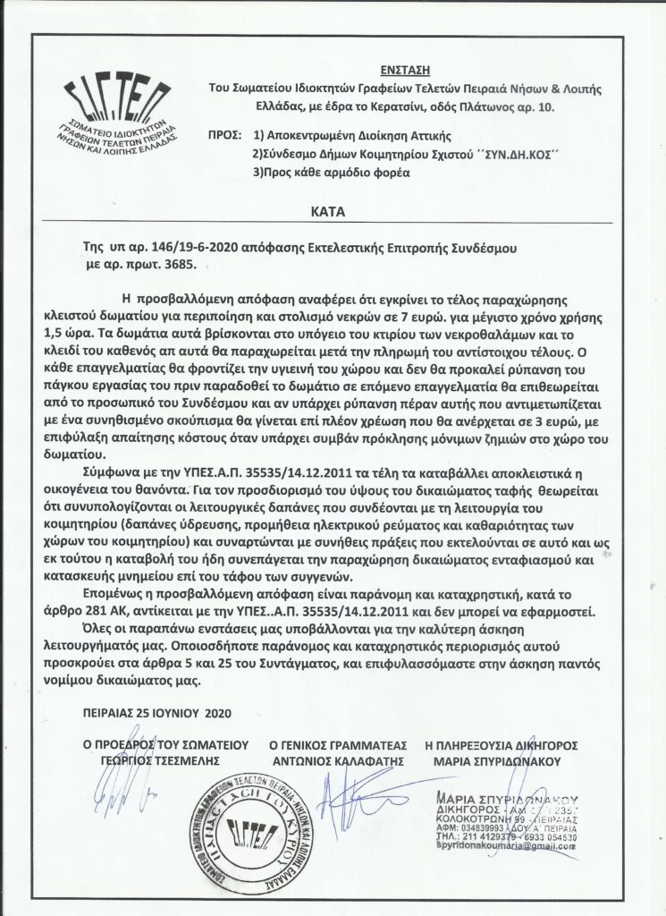 25 ΙΟΥΝΙΟΥ αποστείλαμε την ένσταση μας κατά του τέλους παραχώρησης κλειστού δωματίου για περιποίηση και στόλισμα νεκρού