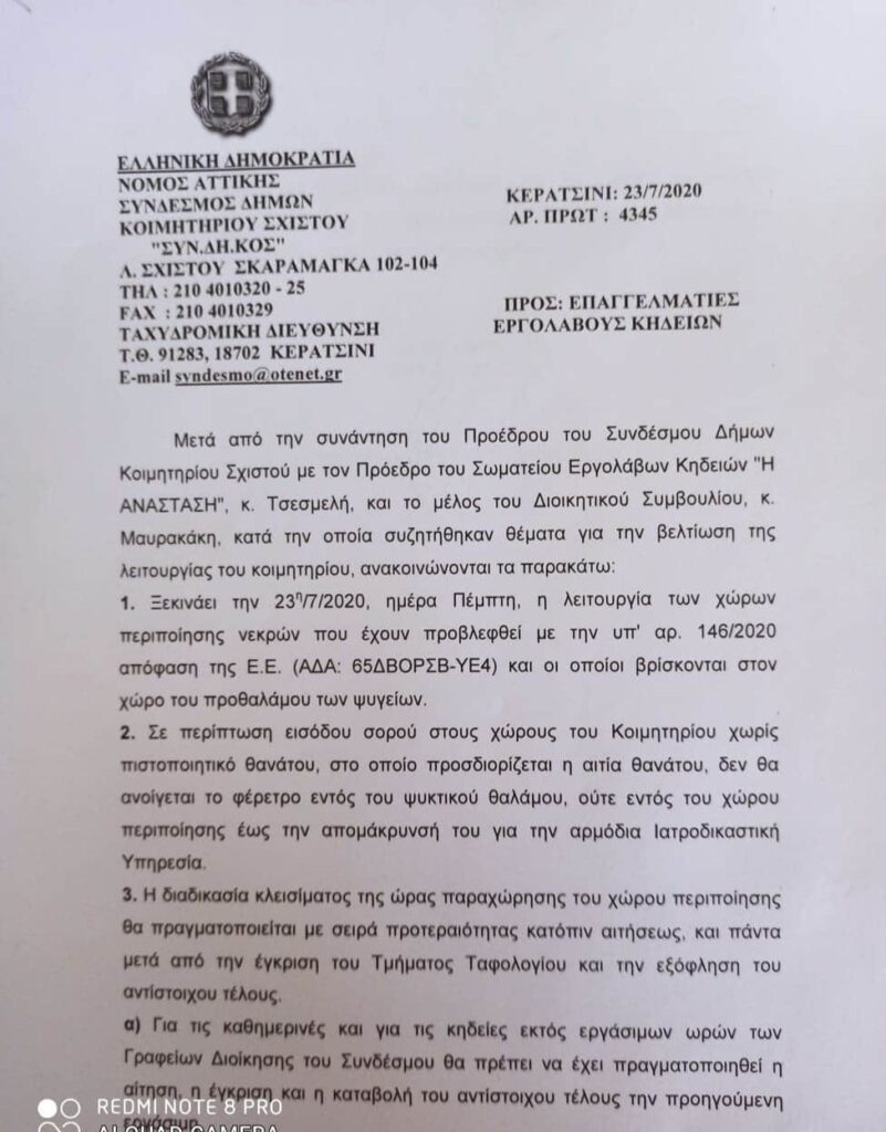 Αρχική/Αποφάσεις Κοιμητηρίου, Τελευταία Νέα/Μετά από την συνάντηση του Πρόεδρου του Συνδέσμου Δήμων Κοιμητηρίου Σχιστού με τον Προεδρο του Σωματείου μας Γεώργιο Τσεσμελή και μέλος του Δ.Σ Μαρία Μαυρακάκη κατά την οποία συζητήθηκαν θέματα για την βελτίωση της λειτουργίας του κοιμητηρίου , ανακοινώνονται τα παρακάτω: