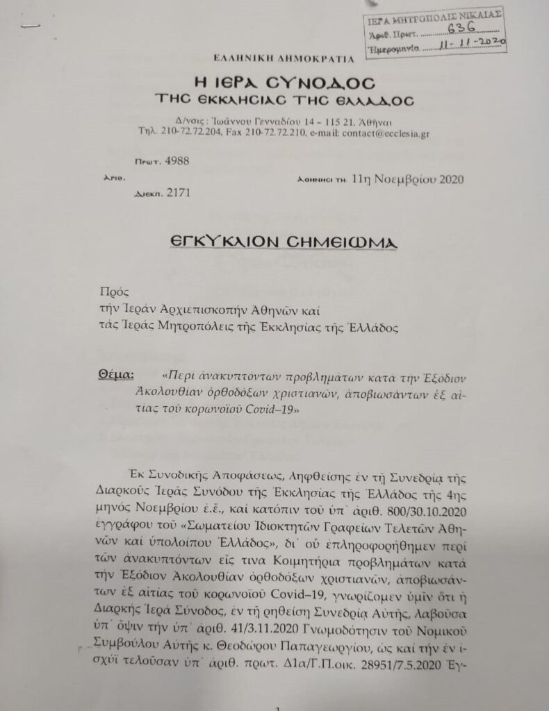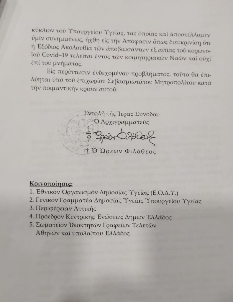 ΕΓΚΥΚΛΙΟ ΣΗΜΕΙΩΜΑ ΑΠΟ ΤΗΝ ΙΕΡΑ ΣΥΝΟΔΟ ΤΗΣ ΕΚΚΛΗΣΙΑ ΤΗΣ ΕΛΛΑΔΟΣ ΓΙΑ ΤΟΥΣ ΧΡΙΣΤΙΑΝΟΥΣ ΟΡΘΟΔΟΞΟΥΣ ΘΑΝΟΝΤΕΣ ΑΠΟ ΚΟΡΩΝΟΪΟ COVID-19