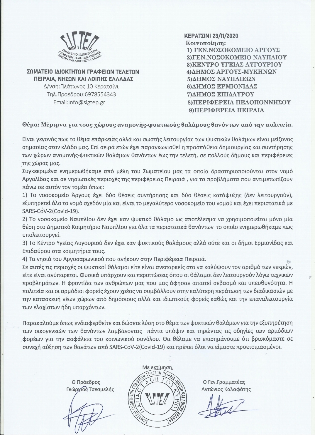 Μέριμνα για ψυκτικούς θαλάμους από την Πολιτεία μετά από ενημέρωση μελών του Σωματείου που δραστηριοποιούνται στον νομό Αργολίδας και σε νησιωτικές περιοχές της περιφέρειας Πειραιά