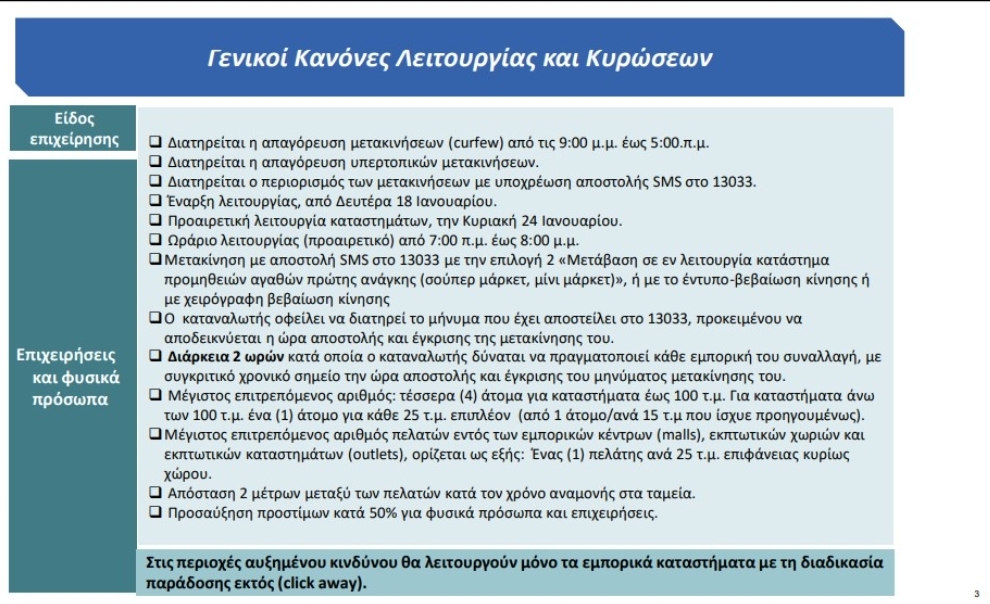 -Η επαναλειτουργία των επιχειρήσεων ξεκινά τη Δευτέρα 18 Ιανουαρίου και δίνεται η δυνατότητα λειτουργίας στα καταστήματα (προαιρετικά) την Κυριακή 24 Ιανουαρίου. Επίσης, οι επιχειρήσεις εφ’ όσον το επιθυμούν μπορούν να λειτουργούν από τις 7 το πρωί μέχρι τις 8 το βράδυ. Σημειώνεται ότι η μετακίνηση προς κάθε επιχείρηση που λειτουργεί γίνεται με την αποστολή SMS με την επιλογή 2 «Μετάβαση σε εν λειτουργία κατάστημα προμηθειών αγαθών πρώτης ανάγκης» ή με το έντυπο-βεβαίωση κίνησης ή με χειρόγραφη βεβαίωση κίνησης. Ο καταναλωτής οφείλει να διατηρεί το μήνυμα που έχει αποστείλει στο 13033 προκειμένου να αποδεικνύεται η ώρα αποστολής του και έγκρισης της μετακίνησης. Ο καταναλωτής δύναται να πραγματοποιεί κάθε εμπορική του συναλλαγή εντός 2 ωρών από την ώρα αποστολής και έγκρισης του μηνύματός του.