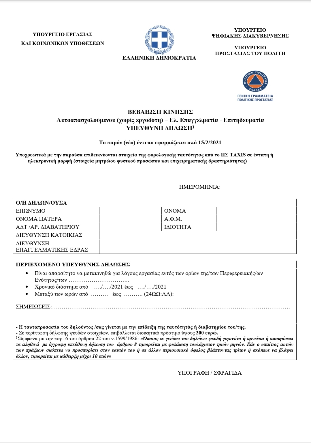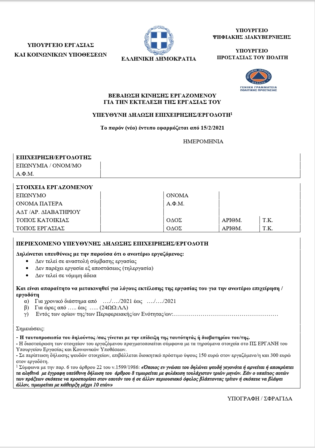 Έντυπο «Βεβαίωση Κυκλοφορίας Εργαζομένου»